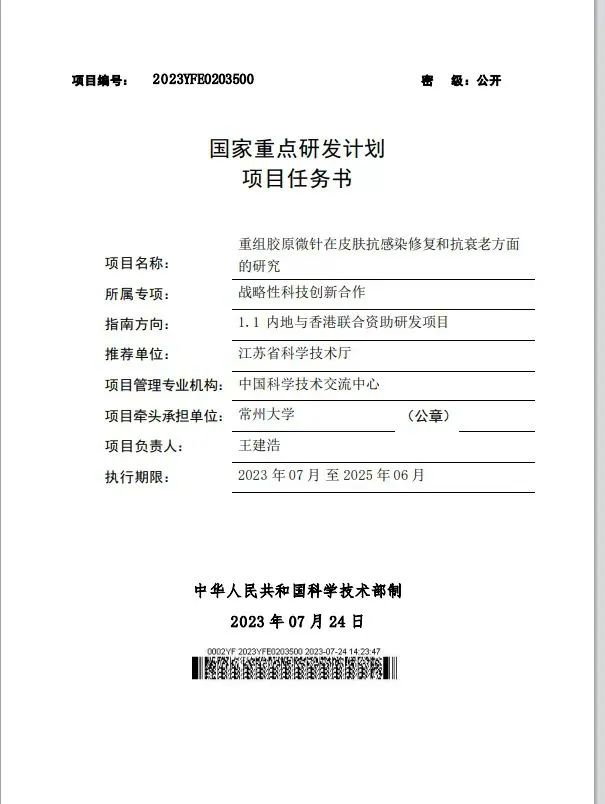 本次指南“戰(zhàn)略性科技創(chuàng)新合作”重點(diǎn)專(zhuān)項(xiàng)是國(guó)家重點(diǎn)研發(fā)計(jì)劃中的港澳聯(lián)合項(xiàng)目,涵蓋了生物技術(shù)、合成生物學(xué)、人工智能等關(guān)鍵領(lǐng)域,對(duì)國(guó)家科技戰(zhàn)略發(fā)展具有深遠(yuǎn)影響。《重組膠原微針在皮膚抗感染修復(fù)和抗衰老方面的研究》的獲批立項(xiàng),對(duì)于我國(guó)醫(yī)療衛(wèi)生、生命科學(xué)、生物醫(yī)藥等領(lǐng)域的發(fā)展有著重大意義。